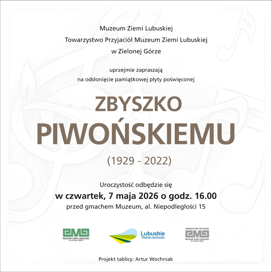 Muzeum Ziemi Lubuskiej oraz Towarzystwo Przyjaciół Muzeum Ziemi Lubuskiej w Zielonej Górze uprzejmie zapraszają na odsłonięcie pamiątkowej płyty poświęconej Zbyszko Piwońskiemu.