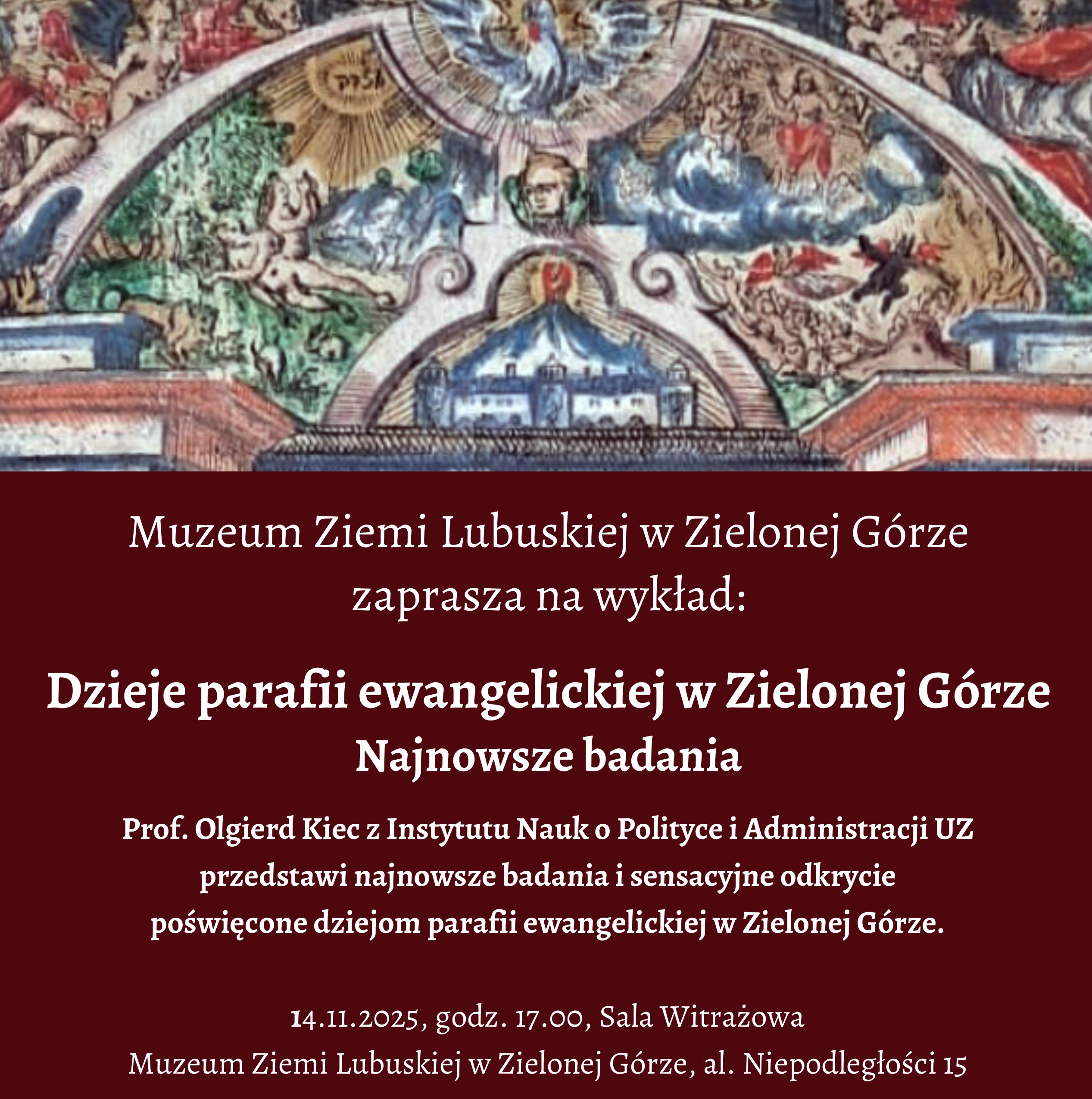 Prof. Olgierd Kiec z Instytutu nauk o Polityce i Administracji Uniwersytetu Zielonogórskiego wygłosi wykład dotyczący jego najnowszych badań prowadzonych w obszarze dziejów zielonogórskiej parafii ewangelickiej. Rozważania sięgną aż XVII wieku. To właśnie wtedy zaczyna się historia, której barwnym elementem stało się sensacyjne odkrycie łączące minione wieki i czasy współczesne. Czego dotyczyło i jakie były jego kulisy – tego „premierowo” dowiecie się Państwo podczas wykładu.
