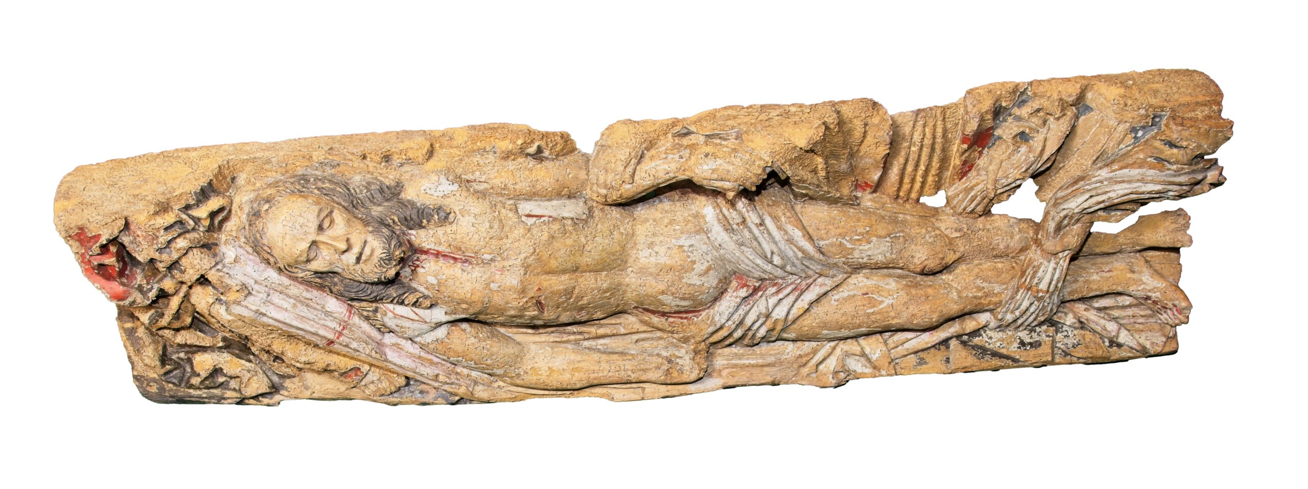 Rzeźba ukazująca scenę Złożenia Chrystusa do grobu jest zachowanym elementem większego przedstawienia predelli ołtarzowej, pochodzącej z kościoła pw. św. Jerzego w Mirocinie Dolnym (powiat nowosolski). Autorstwo dzieła jest przypisywane warsztatowi Mistrza ołtarza z Gościszowic z uwagi na występujące cechy stylistyczne. Jest to prostokątnie wydłużona, szeroka u podstawy deska. Na tle draperii (całunu) naga postać martwego Chrystusa składanego do grobu przez osoby (ukazane fragmentarycznie, jedynie poprzez parę rąk trzymających całun. Śladowo zachowana polichromia w załamaniach fałd w kolorach: biały, czerwony i błękitny.